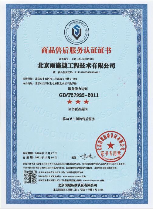 雨施捷移動衛(wèi)生間商品售后服務認證證書,是對我們售后人員很大的認可。