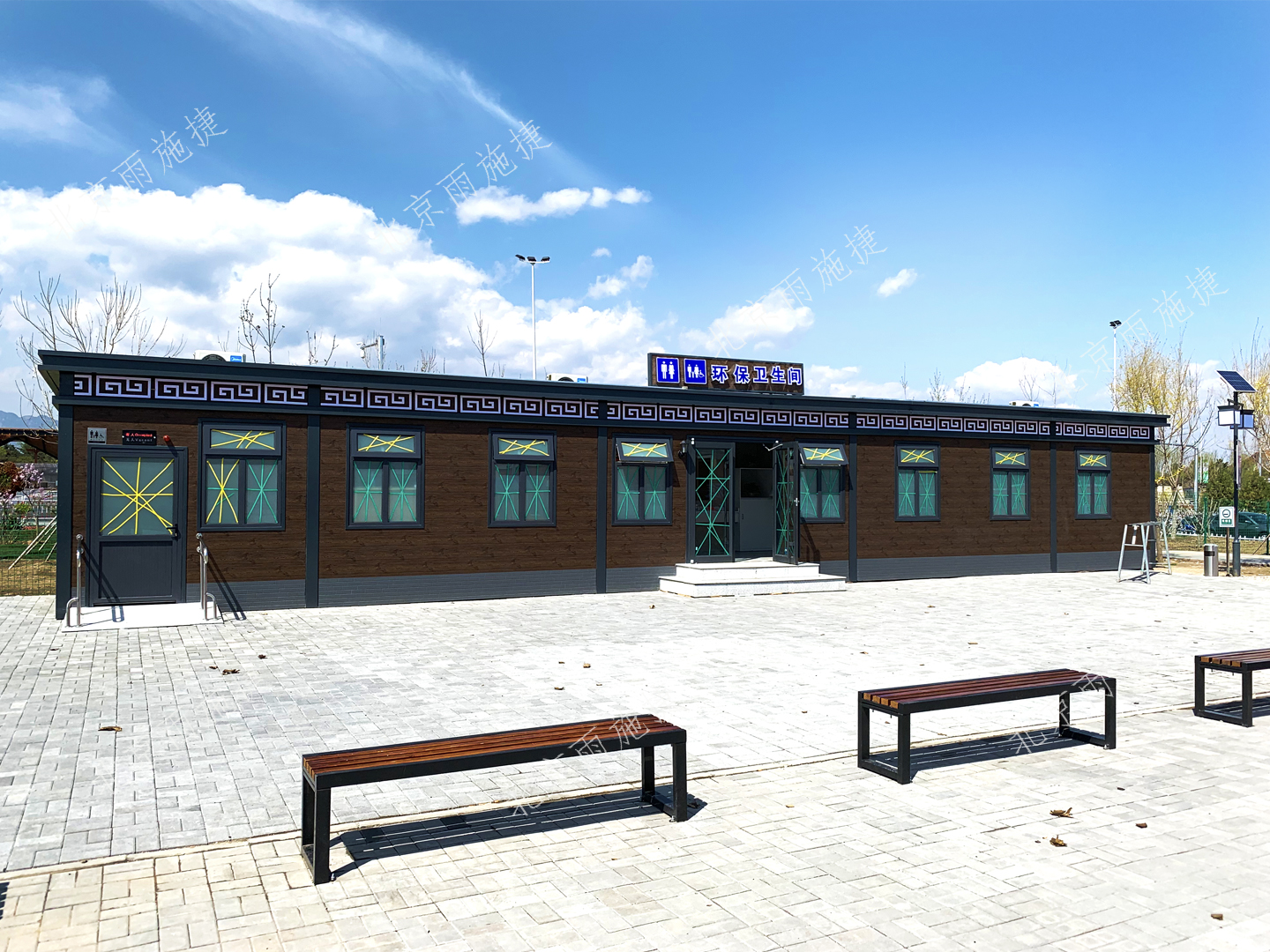 公廁外墻選用仿木紋金屬雕花板看起來簡潔大方與周邊環境和建筑相協調。 廁所的結構和整體功能設計充分體現出高性價比、高科技含量、高使用舒適度、高管理便捷性的特點。