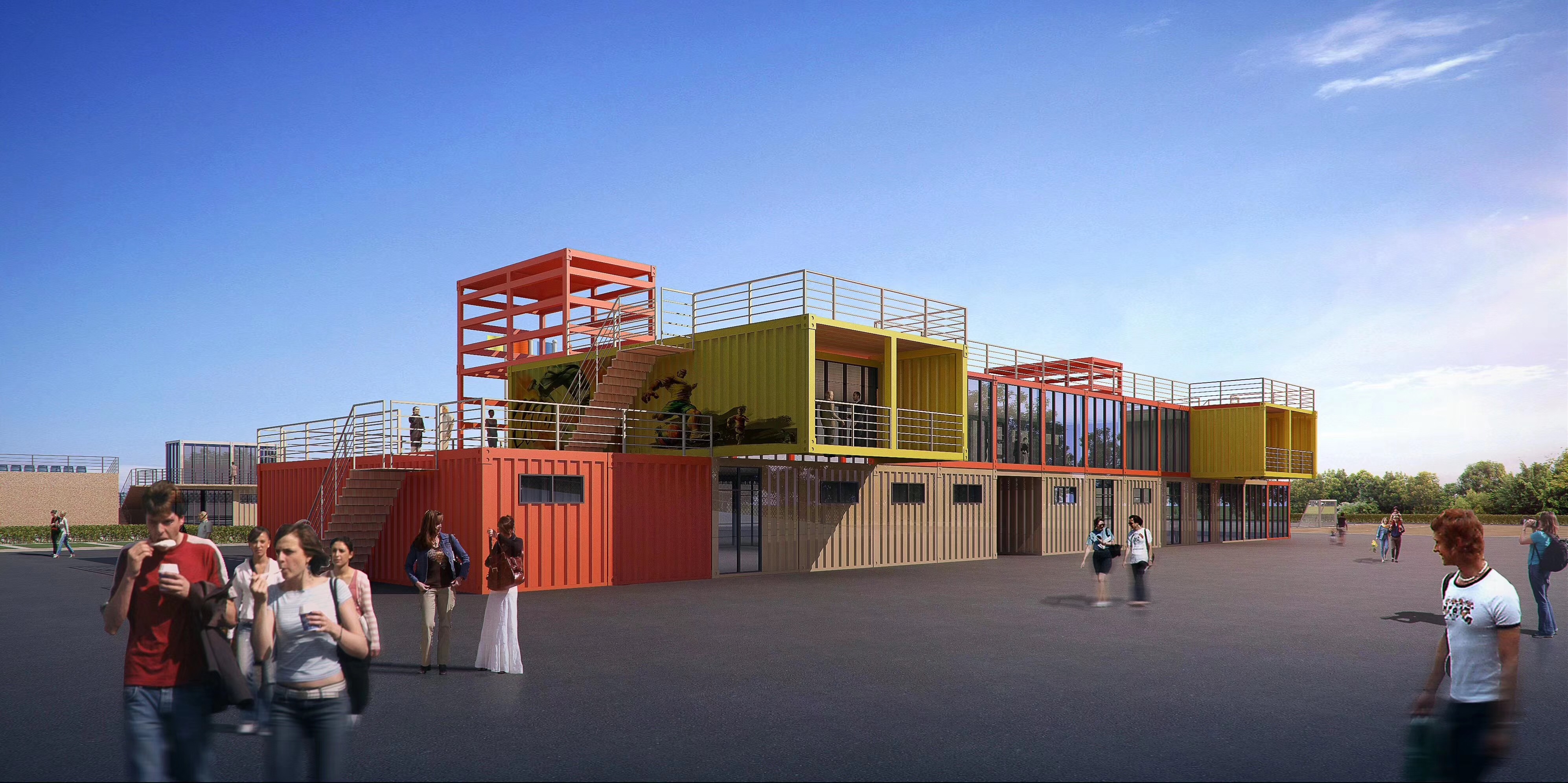 北京雨施捷應邀為該公園內的足球場生產設計集裝箱模塊房項目,此項目總占地面積約1000m3多平,是集衛生間、球員更衣室、超市、茶飲為一體的智能集裝箱模塊房建筑。