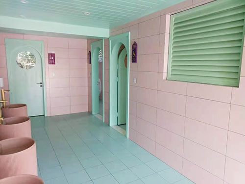 講完了他的核心處理技術,再來看一下里面的內(nèi)室裝飾,哇,是不是圓了你的小公主夢,芭比粉的墻壁,粉色的洗手盆,金色的洗手龍頭,紫色的標識牌,充滿夢幻的拱型門。怎么樣是不是狠狠的滿足了一次兒時的少女心,如果不說它是一座廁所,是不是有一種很想住進來的沖動。